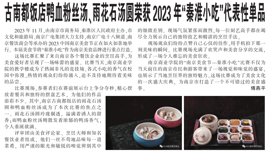 古南(nán)都(dōu)飯店(diàn)鴨血粉絲湯、雨(yǔ)花(huā)石湯圓榮獲2023年(nián)“秦淮小(xiǎo)吃(chī)”代表性單品